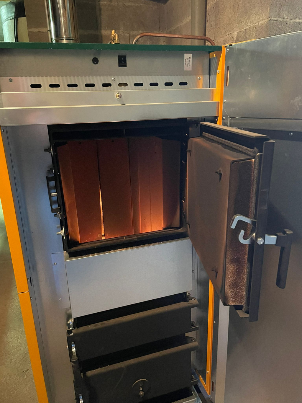 Installation d'une chaudière bois (bûches) de 18 kW en remplacement d'une chaudière fioul, avec ballon tampon de 1000 litres, pour le chauffage et l'eau chaude sanitaire.