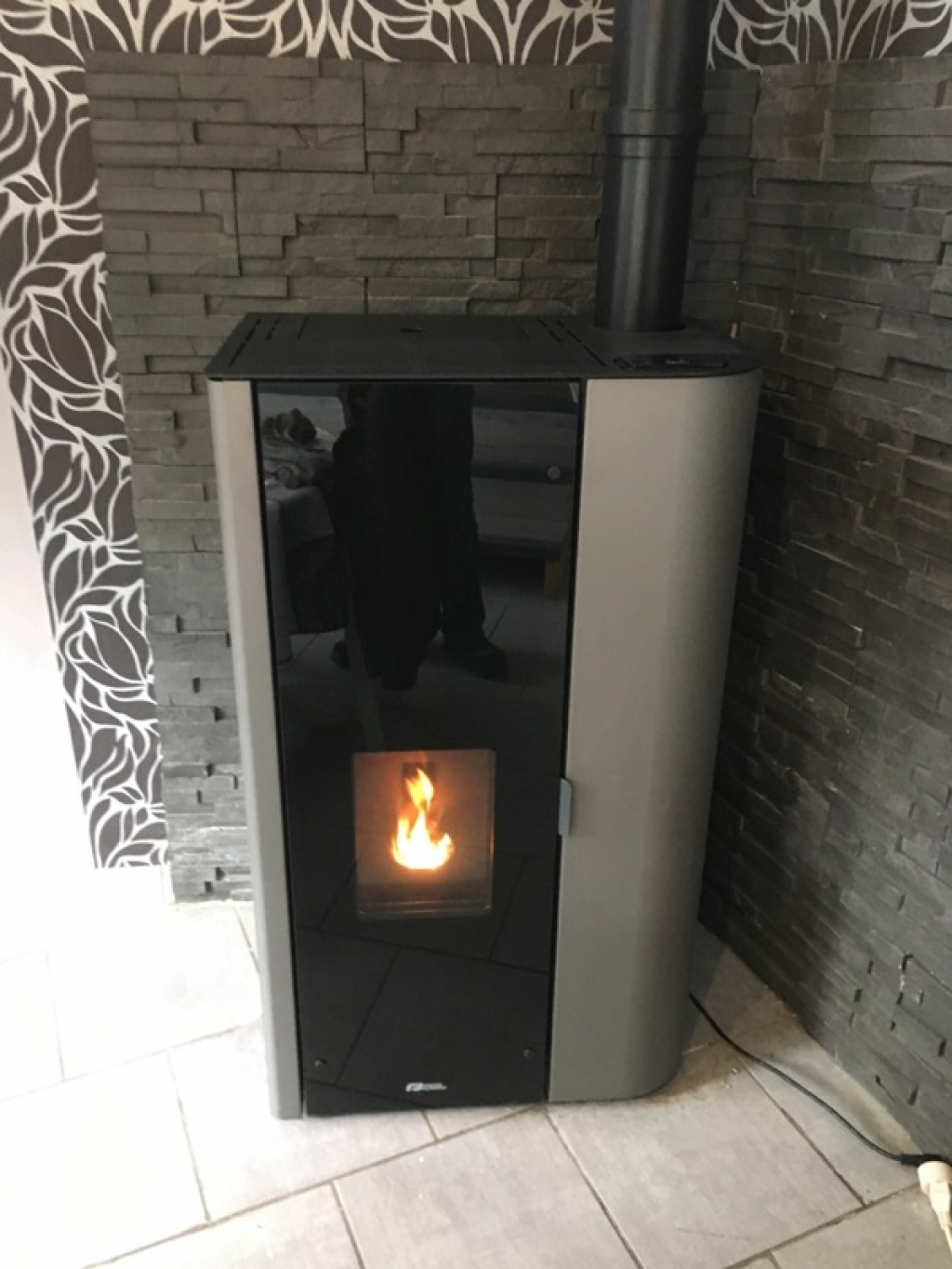 Installation d'un poêle à granulés à Thaon-les-Vosges (88150), modèle Albia 8 de la marque Fonte Flamme, porte en verre sérigraphié noir, côtés en acier gris. Poêle à granulés à faible encombrement grâce à une sortie des fumées par le dessus.